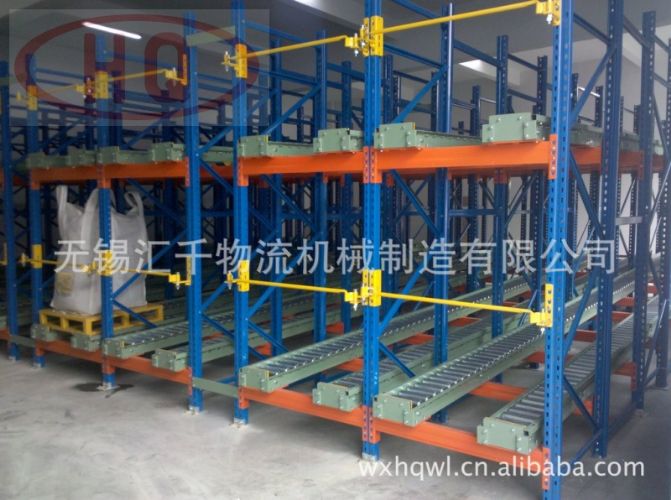 重力式貨架又叫輥道式貨架,屬于倉儲貨架中的托盤類存儲貨架。重力式貨架是橫梁式貨架衍生品之一,貨架結構與橫梁式貨架相似,只是在橫梁上安上滾筒式軌道,軌道呈3-5°傾斜。托盤貨物用叉車搬運至貨架進貨口,利用自重,托盤從進口自動滑行至另一端的取貨口。重力式貨架屬于先進先出的存儲方式。